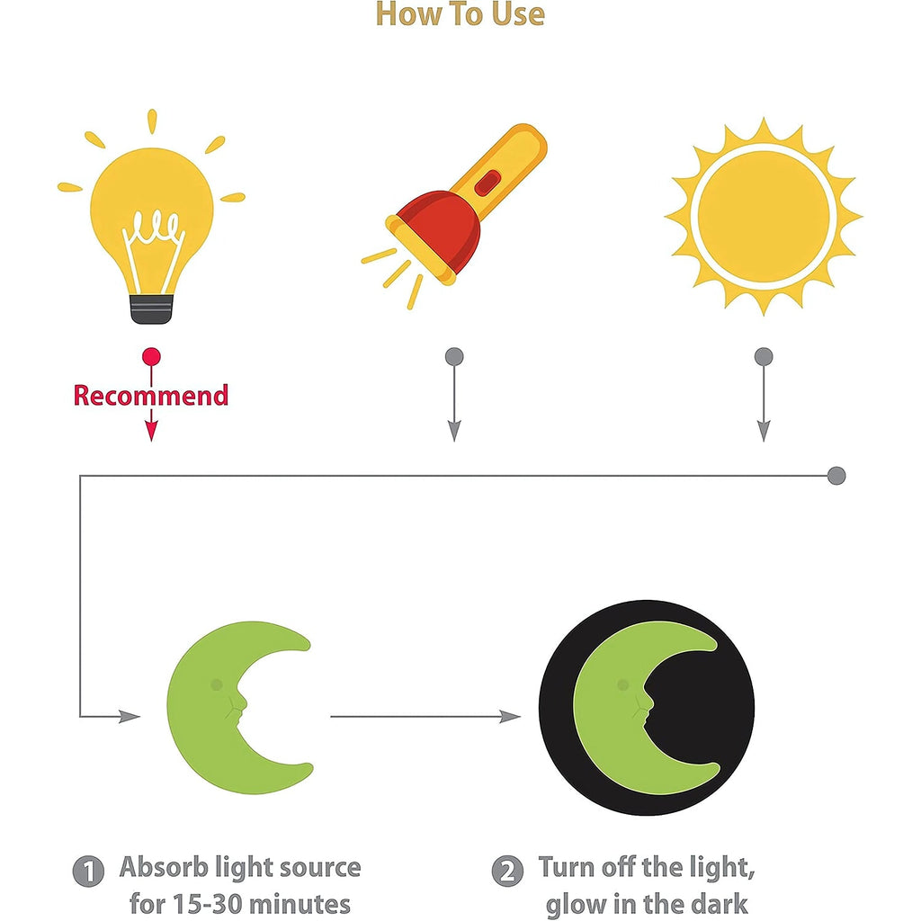 Glowing Stars and Moon can help your child not be afraid of darkness. Glowing stickers can create a warm atmosphere and help your child fall asleep soon. what's more, Present the gift that is given away every night and put a smile on the faces of the people you love as they gaze into the glow of the Simple.